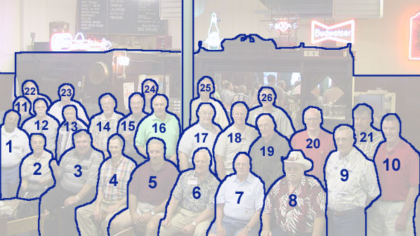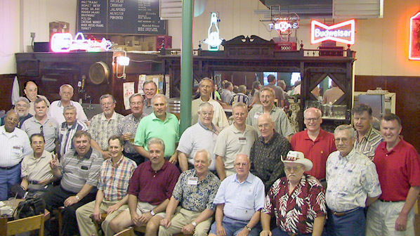 This group photo is from our second dinner at the 80+ year old world famous Schlio's Delicatessen (pronounced "She-lows" not "Shy-lows"). We had been chowing down on some great Wiener-schnitzel, world renowned split pea soup with knockwurst, all washed down with some excellent drafts from their extensive selection of "Suds". I really don't know where we put it all. I guess all the talking and flipping through the photo albums all day made us hungry. So hungry that not everyone could get up from their tables in time for this photo.